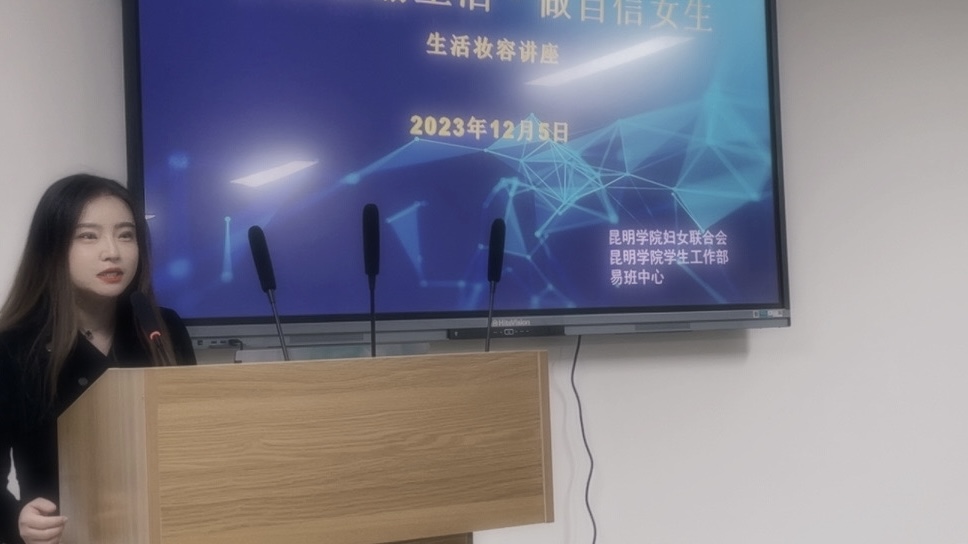 为更好地彰显女大学生优雅气质,展示当代女大学生积极向上的巾帼风采,丰富校园文化生活。12月5日,校妇联携手校学工部、易班中心在“一站式”学生社区,特邀专业美容师梁蓉女士为女大学生们开展了“妆点靓丽生活,做自信女生”生活妆容讲座。