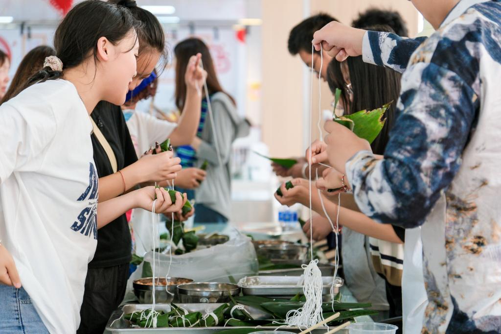 6月7日中午活动在沁园教工食堂启动,活动现场布置了粽子品鉴区和体验区,粽子品鉴区后勤集团各餐饮企业大展厨艺,制作了各种口味、食材的粽子让师生们品鉴美味;体验区邀请到了三位官渡区包粽子的能手分享包粽子的技巧和心得,师生们在指导下,一起动手,积极实践,亲手包出一只只清新可爱、形状各异的粽子,大家相互展示自己的劳动成果,佩戴上表达祈福安康的五彩手绳,整个活动现场充满了欢声笑语,充满祥和喜乐的气氛。