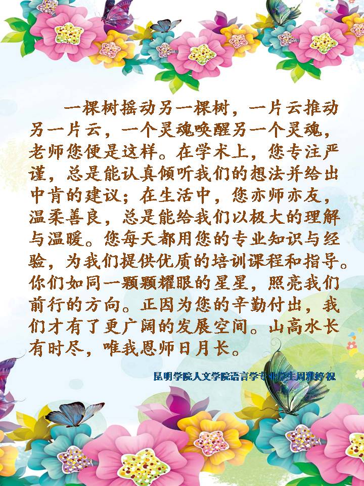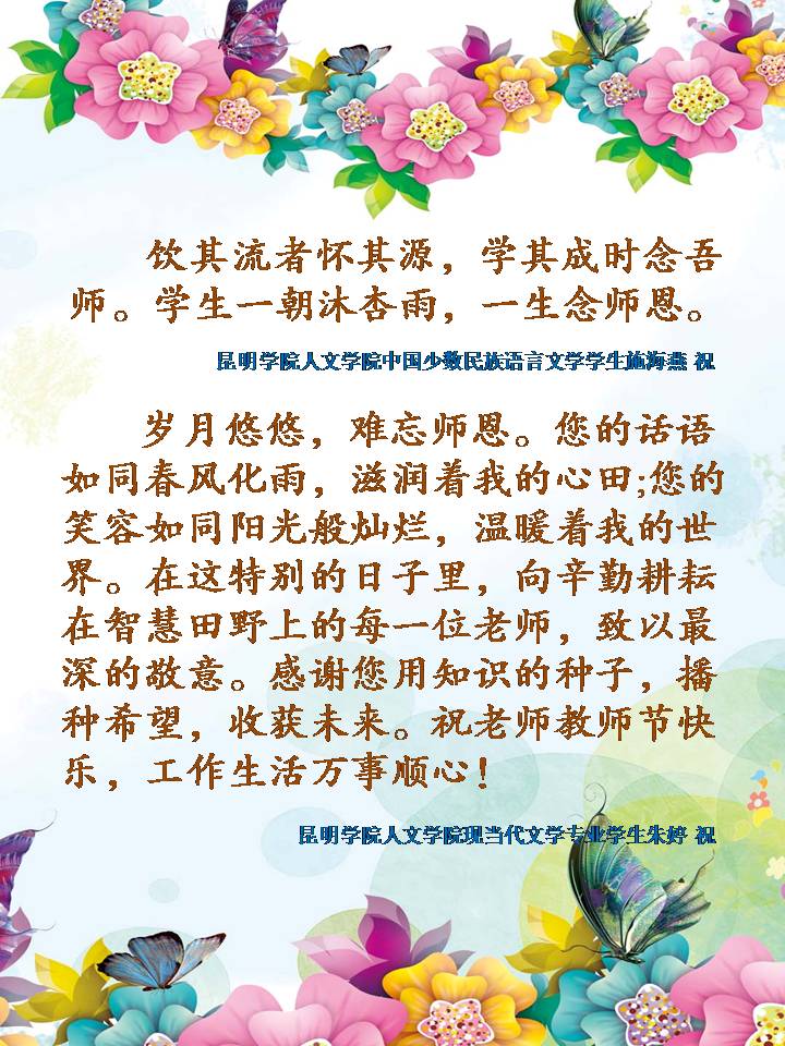 9月10日,为弘扬尊师重教的传统美德,增强师生之间的情感交流,促进和谐共进的校园文化氛围,学校妇联携手人文学院举办了祝福语征集活动。同学们纷纷用最质朴或最文艺的语言,向辛勤耕耘在教育一线的老师们表达了最真挚的敬意与感恩之情。