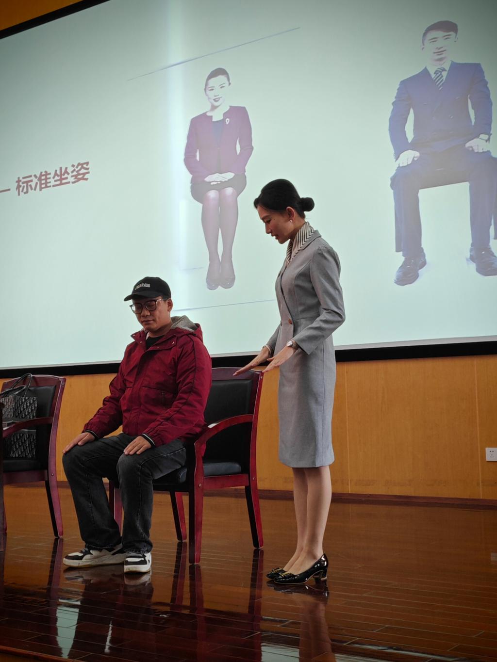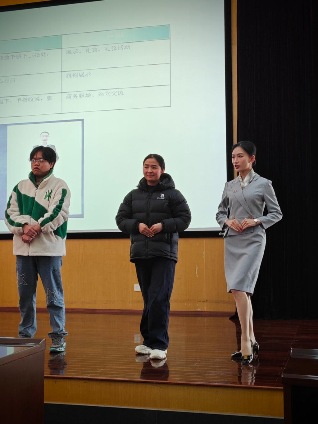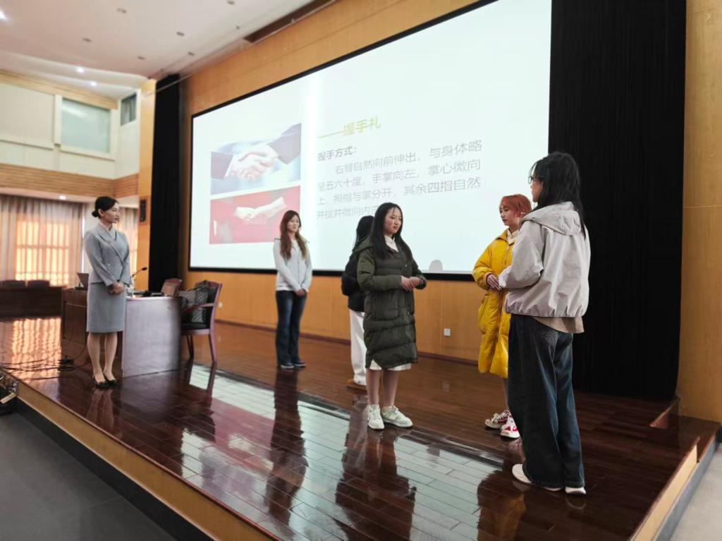 在实操环节,崔谨老师针对站姿、坐姿、走姿等形体礼仪,以及握手、介绍等社交礼仪进行了现场示范。她邀请师生上台互动,一对一纠正不规范的动作,并通过情景模拟的方式,让大家掌握不同职场场景下的礼仪技巧。现场气氛热烈,师生们积极参与、认真练习,在亲身体验中深化了对礼仪知识的理解。