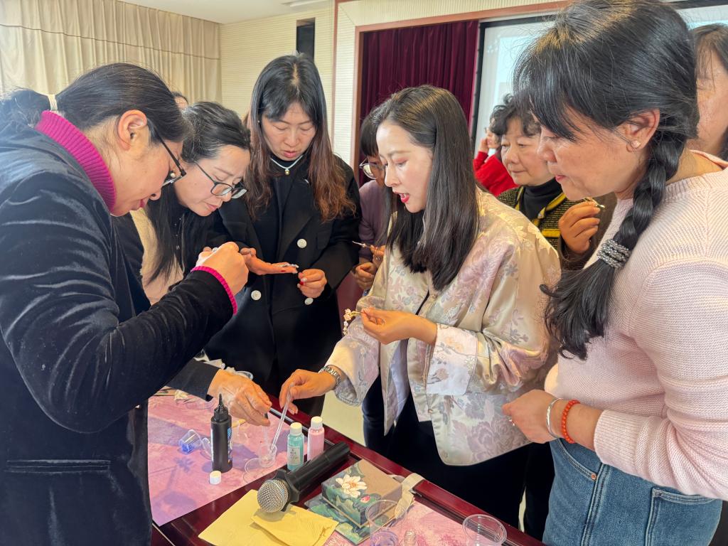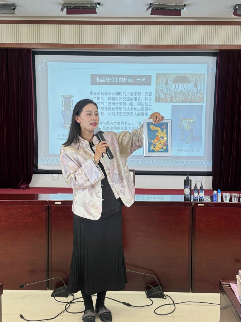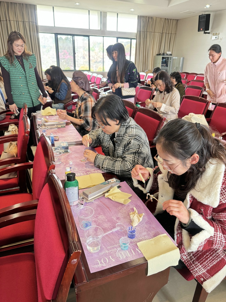 活动现场春意融融、氛围雅致。专业指导老师为大家介绍掐丝珐琅的历史渊源、工艺特点与文化价值,细致讲解掐丝、点蓝、封胶等核心工序,并进行示范教学。在手工创作环节,女教职工们专注打磨每一处细节,彩砂填色、层层点蓝,指尖流转间,一件件各具特色的作品渐次成型。现场交流温馨、笑语不断,大家在匠心手作中感受非遗之美,度过一段充实而愉悦的时光。